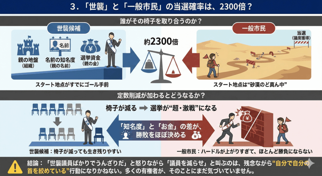 つまり、定数削減に賛成するということは、「一般人の政治参加を諦めさせ、世襲貴族による政治支配を強化すること」に他ならない。