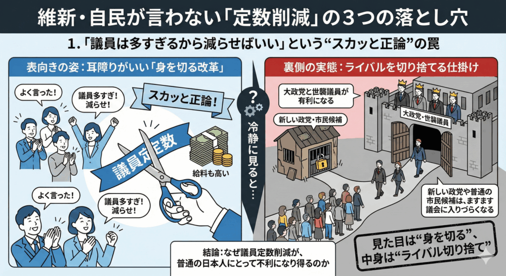 「定数削減」は、“身を切る改革”ではなく、“ライバルを切り捨てる改革”と批判されても仕方がない仕組みになっている可能性が高い。